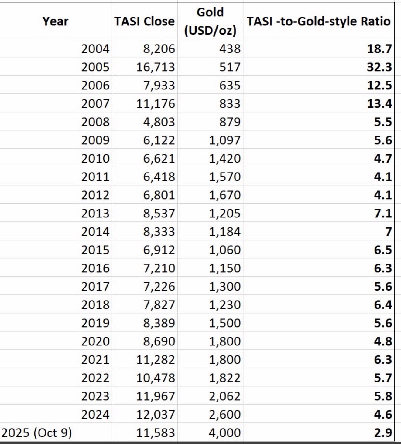 ملحوظة : تم استخدام إغلاقات سنوية لـ تاسي وأسعار الذهب بالدولار.